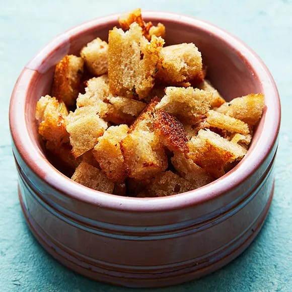 Släng inte gamla brödskivor som ligger och skräpar. Skär upp dem i mindre bitar och gör krutonger. Stek brödbitarna i smör eller olja tills de blir gyllene och krispiga. Krutonger är gott att toppa soppan eller salladen med. Dessutom går det snabbt och enkelt att göra. Observera att brödet inte ska vara så gammalt att det har börjat att mögla.